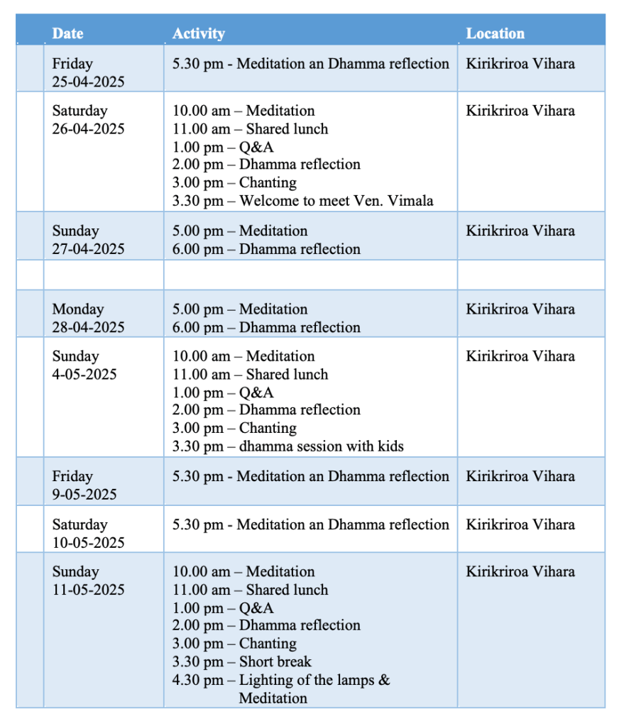 Venerable Vimala from Dhammasara Nuns’ Monastery in Western Australia will be visiting our urban vihara in Kirikiriroa from 22 of April to 12 of May 2025. During her stay, the community will be offering a variety of opportunities to engage with the Dhamma, including Dhamma talks, guided meditations, and sessions for teenagers.